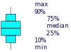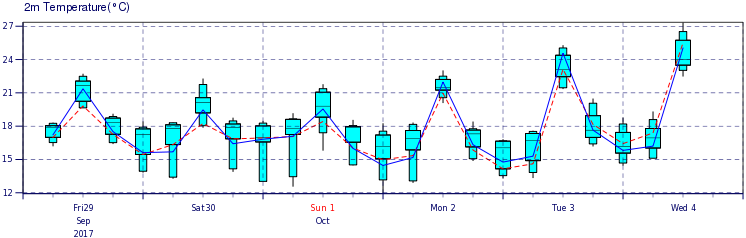 The Ensemble Meteogram displays the time evolution of the distribution of selected weather parameters in the COSMO-LEPS ensemble forecasts for a given location. The forecast distribution at each forecast range is represented by a box-and-whiskers plot showing the median (short horizontal line), the 25th and 75th percentiles (wide vertical box), 10th and 90th percentiles (narrower boxes) and the minimum and maximum values (vertical lines).