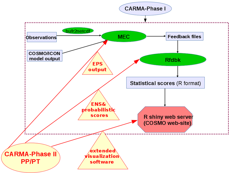 In the frame of the CARMA Priority Project (completed 2021), the VERSUS verification software environment was replaced with the MEC-Rfdbk software developed by DWD, as the Common Verification Software (CVS) used to perform most of the verification activities in the consortium. The MEC-Rfdbk system is mainly used for the production of the Common Plot (CP) verification; spatial verification is performed with other available tools such as VAST.