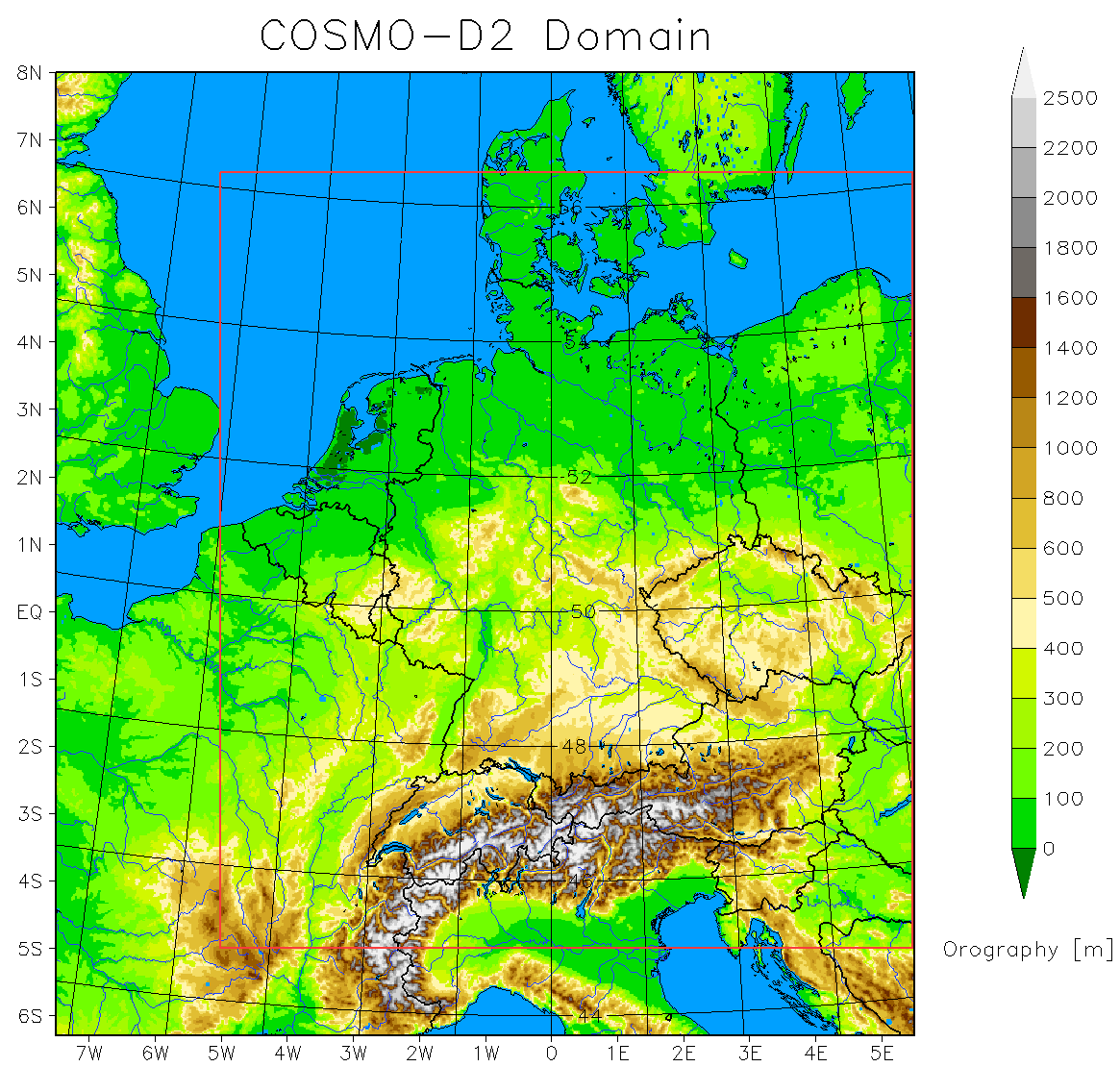 The integration domain of COSMO-D2 covers the whole of Germany, Switzerland Austria and parts of the other neighboring countries. It has 651x716 grid points in the horizontal and 65 vertical levels. The lowest level is 10 meters above ground, similar as in COSMO-DE. It also uses the same rotation with pollat=40.0o and pollon=-170.0o. The resolution used now is 2.2 km (0.02o). The rotated lat-lon coordinates of the lower left and the upper right corner of the integration domain are lon = -1.92o, lat = -2.72o and lon = 11.08o, lat = 11.58o, respectively. Figure 1 shows the integration domain with the domain of the former COSMO-DE indicated.